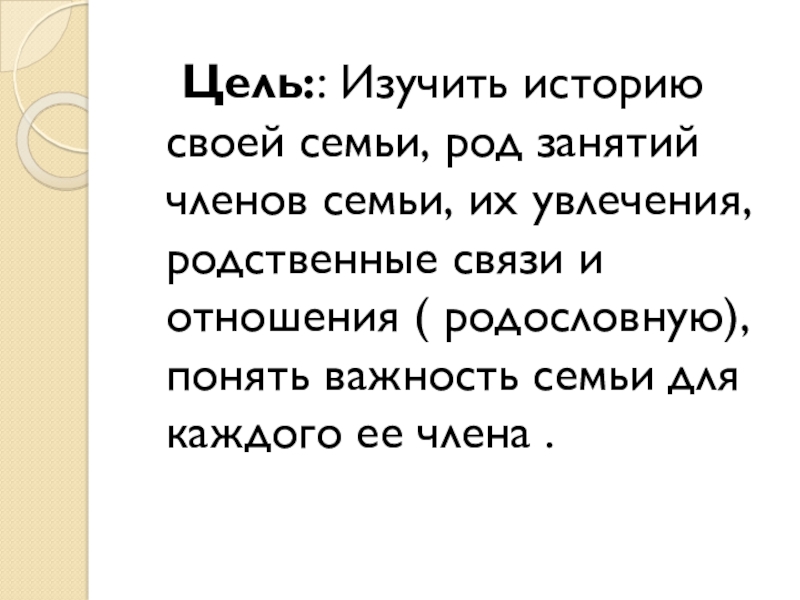 Цель:: Изучить историю своей семьи, род занятий членов семьи, их увлечения, родственные связи и отношения