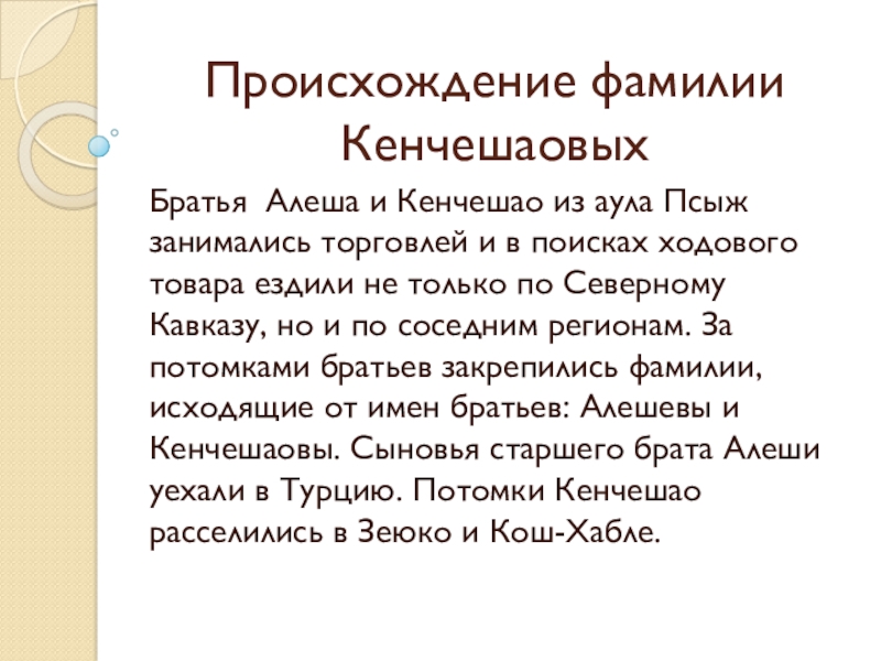 Происхождение фамилии  КенчешаовыхБратья Алеша и Кенчешао из аула Псыж занимались торговлей и в поисках ходового товара
