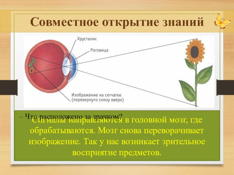 Сигналы направляются в головной мозг, где обрабатываются. Мозг снова переворачивает изображение. Так у нас возникает зрительное восприятие предметов.