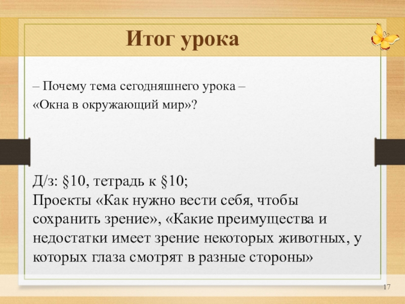 Проекты «Как нужно вести себя, чтобы сохранить зрение», «Какие преимущества и недостатки имеет зрение некоторых животных, у которых глаза смотрят в разные стороны»