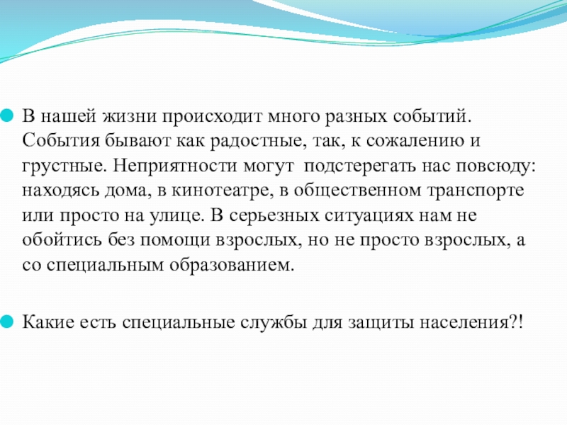 так, к сожалению и грустные. Неприятности могут подстерегать нас повсюду: находясь дома, в кинотеатре, в общественном транспорте или просто на улице. В серьезных ситуациях нам не обойтись без помощи взрослых, но не просто взрослых, а со специальным образованием.
