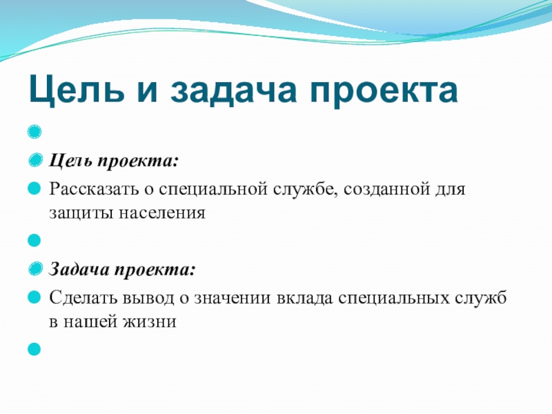 Цель и задача проекта Цель проекта:Рассказать о специальной службе, созданной для защиты населения Задача проекта:Сделать вывод о значении вклада специальных служб в нашей жизни