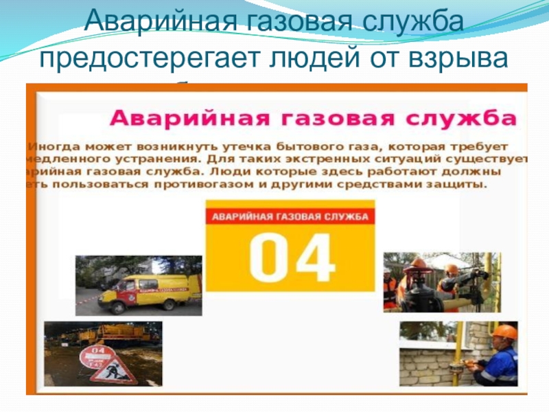 Слайд 7Аварийная газовая служба предостерегает людей от взрыва бытового газа.