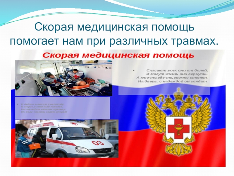Слайд 5Скорая медицинская помощь помогает нам при различных травмах.