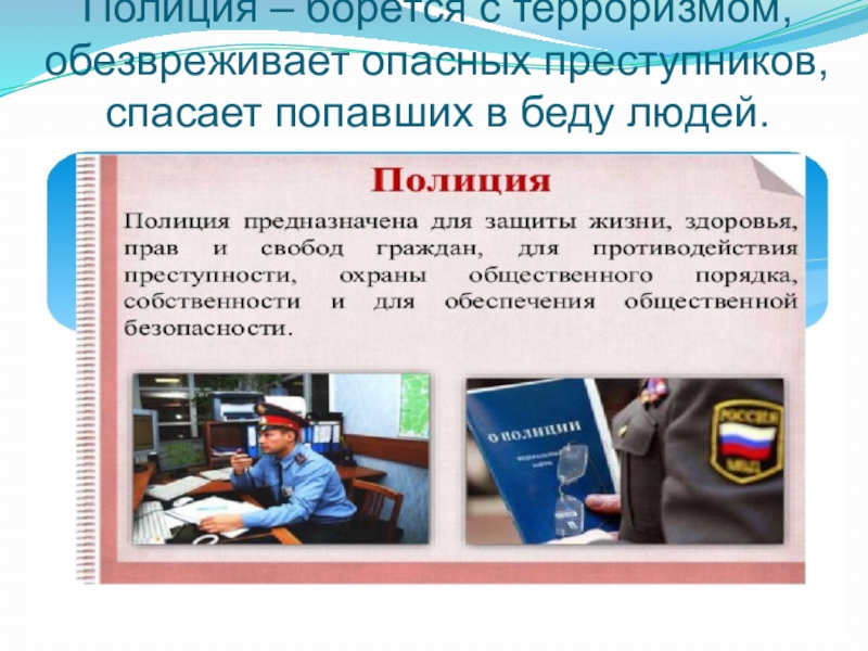 Слайд 8Полиция – борется с терроризмом, обезвреживает опасных преступников, спасает попавших в