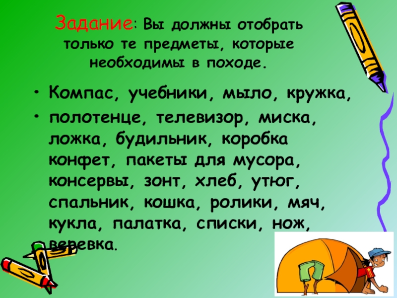 полотенце, телевизор, миска, ложка, будильник, коробка конфет, пакеты для мусора, консервы, зонт, хлеб, утюг, спальник, кошка, ролики, мяч, кукла, палатка, списки, нож, веревка.