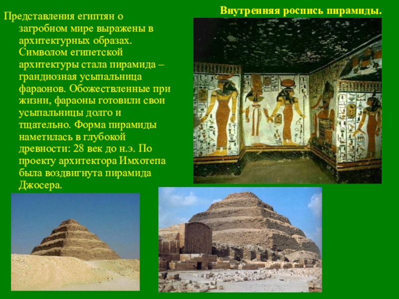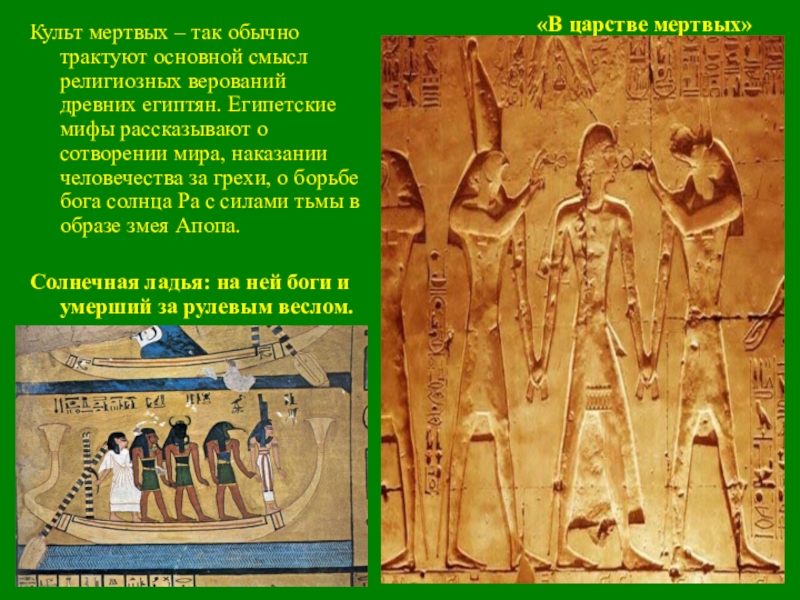 Каждый египтянин должен был сохранить в вечности своё тело, чтобы обрести покой и блаженство. Так возник обряд мумификации и традиция сохранения мумий в гробницах.