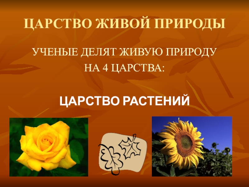 ЦАРСТВО ЖИВОЙ ПРИРОДЫУЧЕНЫЕ ДЕЛЯТ ЖИВУЮ ПРИРОДУ НА 4 ЦАРСТВА:ЦАРСТВО РАСТЕНИЙ