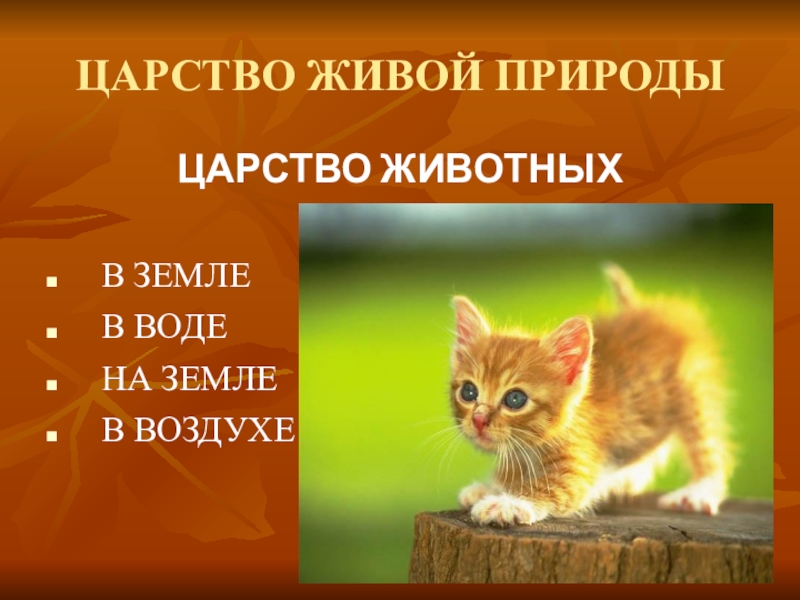 ЦАРСТВО ЖИВОЙ ПРИРОДЫЦАРСТВО ЖИВОТНЫХВ ЗЕМЛЕВ ВОДЕНА ЗЕМЛЕВ ВОЗДУХЕ