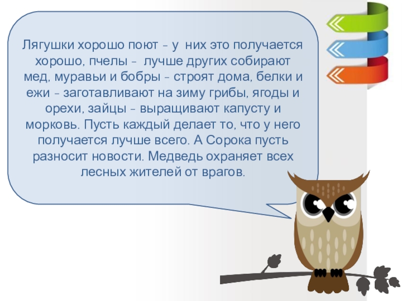 лучше других собирают мед, муравьи и бобры - строят дома, белки и ежи - заготавливают на зиму грибы, ягоды и орехи, зайцы - выращивают капусту и морковь. Пусть каждый делает то, что у него получается лучше всего. А Сорока пусть разносит новости. Медведь охраняет всех лесных жителей от врагов.