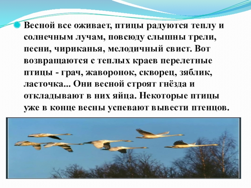 Слайд 3Весной все оживает, птицы радуются теплу и солнечным лучам, повсюду слышны
