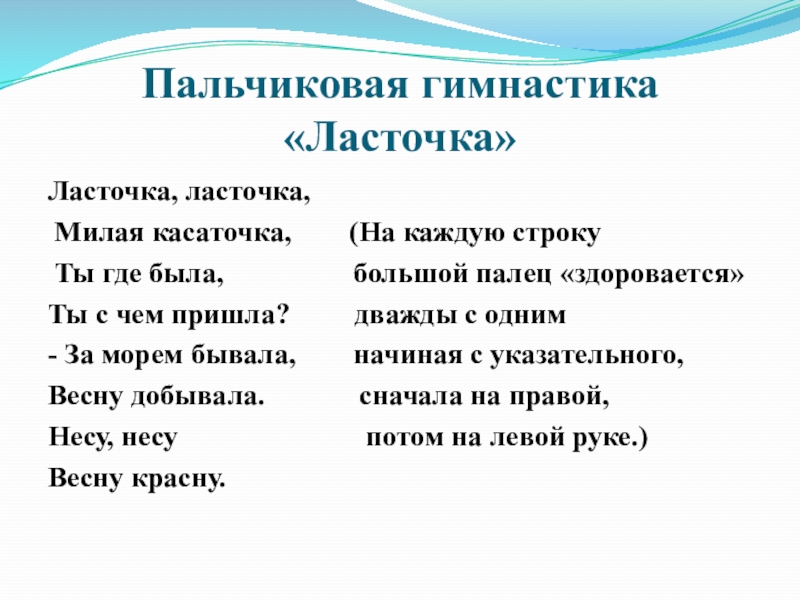 Слайд 12Пальчиковая гимнастика «Ласточка»