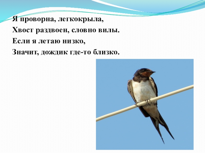 Слайд 9У ласточки стройное, обтекаемое тело и длинные узкие крылья. Клюв короткий, лапки