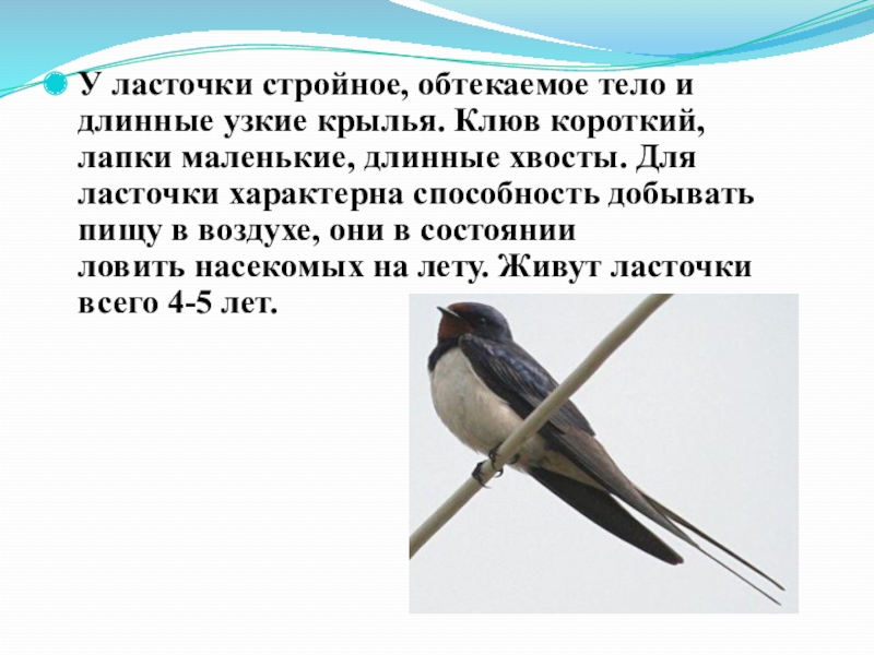 маленькие, длинные хвосты. Для ласточки характерна способность добывать пищу в воздухе, они в состоянии ловить насекомых на лету. Живут ласточки всего 4-5 лет.