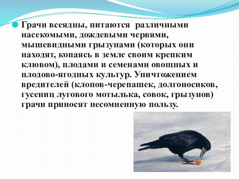 Слайд 6Грачи всеядны, питаются различными насекомыми, дождевыми червями, мышевидными грызунами (которых они
