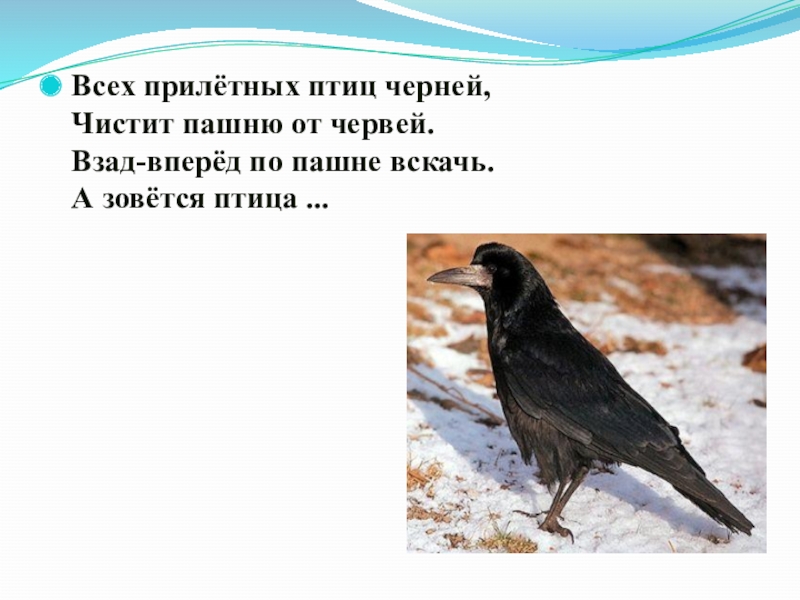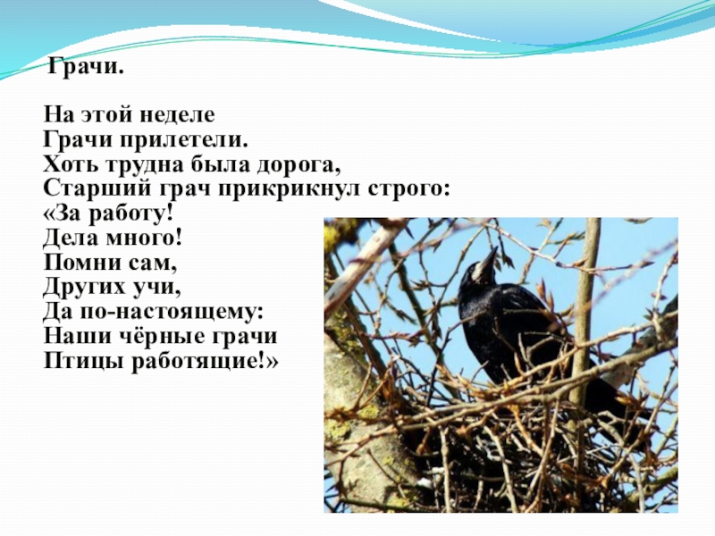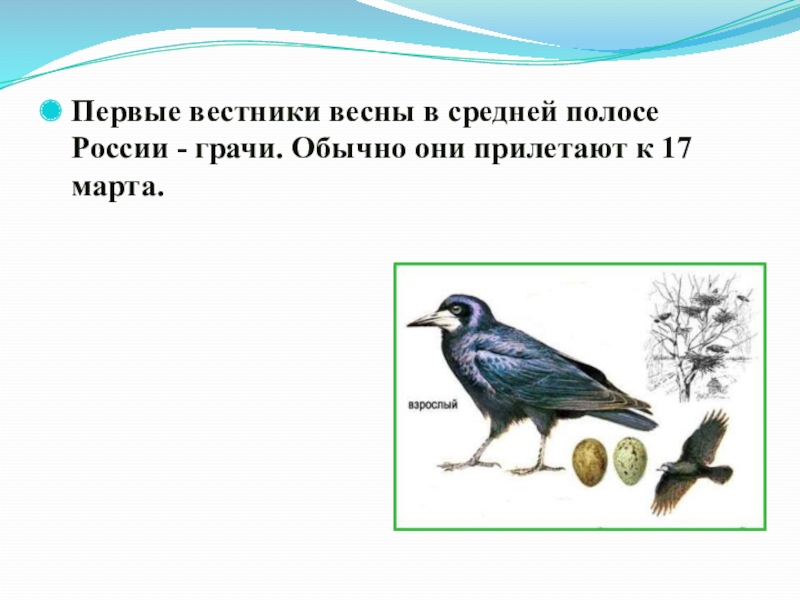 Слайд 5Первые вестники весны в средней полосе России - грачи. Обычно они