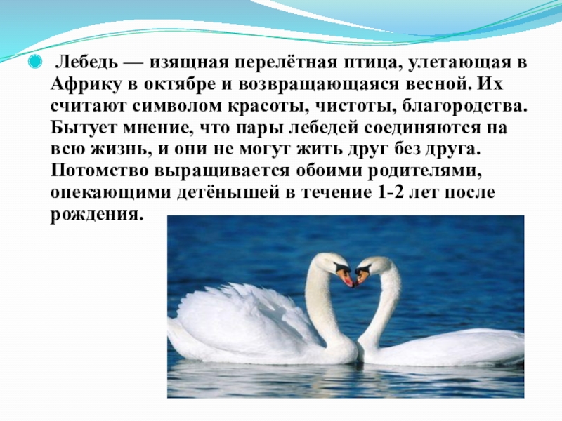 и возвращающаяся весной. Их считают символом красоты, чистоты, благородства. Бытует мнение, что пары лебедей соединяются на всю жизнь, и они не могут жить друг без друга. Потомство выращивается обоими родителями, опекающими детёнышей в течение 1-2 лет после рождения.