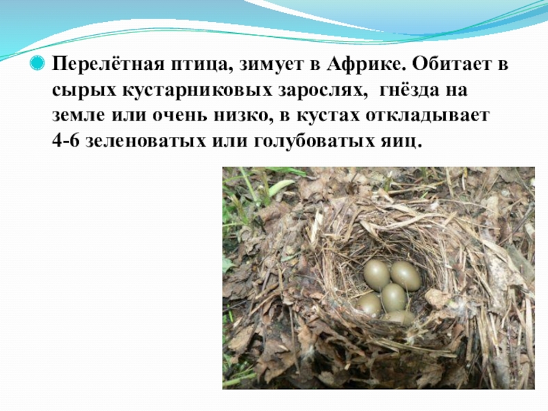 Слайд 17Перелётная птица, зимует в Африке. Обитает в сырых кустарниковых зарослях, гнёзда на земле
