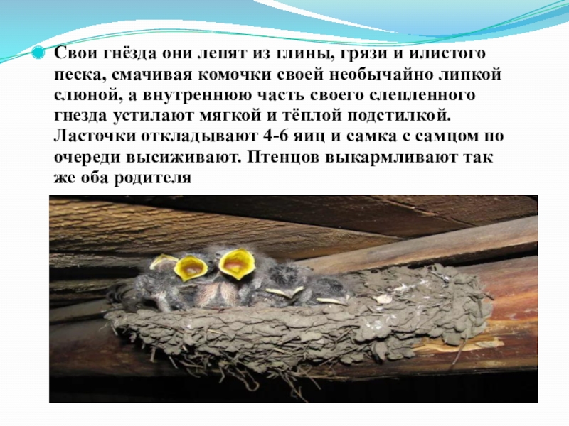 Слайд 10Свои гнёзда они лепят из глины, грязи и илистого песка, смачивая