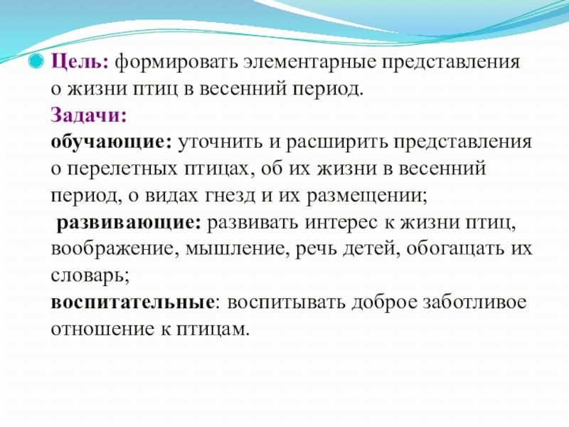 Слайд 2Цель: формировать элементарные представления о жизни птиц в весенний период.