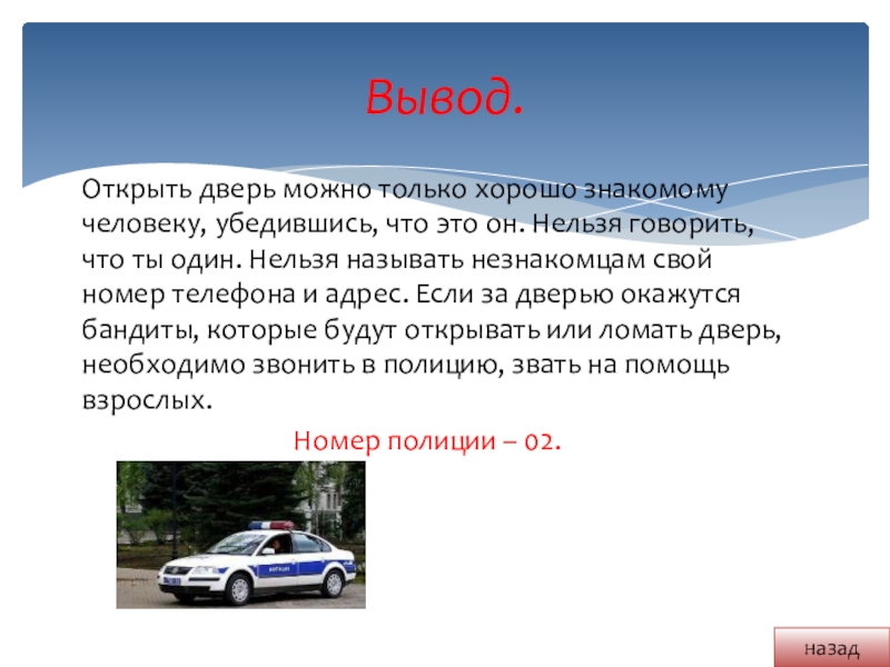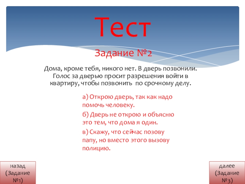 Дома, кроме тебя, никого нет. В дверь позвонили. Голос за дверью просит разрешения войти в квартиру, чтобы позвонить по срочному делу.
