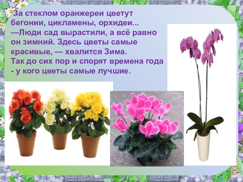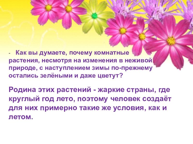 Родина этих растений - жаркие страны, где круглый год лето, поэтому человек создаёт для них примерно такие же условия, как и летом.