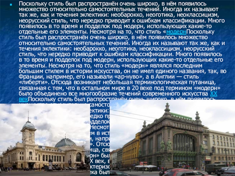 самостоятельных течений. Иногда их называют так же, как и течения эклектики: необарокко, неоготика, неоклассицизм, неорусский стиль, что нередко приводит к ошибкам классификации. Много появилось в то время и подделок под модерн, использующих какие-то отдельные его элементы. Несмотря на то, что стиль «модернПоскольку стиль был распространён очень широко, в нём появилось множество относительно самостоятельных течений. Иногда их называют так же, как и течения эклектики: необарокко, неоготика, неоклассицизм, неорусский стиль, что нередко приводит к ошибкам классификации. Много появилось в то время и подделок под модерн, использующих какие-то отдельные его элементы. Несмотря на то, что стиль «модерн» являлся последним большим стилем в истории искусства, он не имел единого названия, так, во Франции, например, его называли «ар-нуво», а в Англии — стиль «либерти». Отсюда возникает небольшая терминологическая путаница, связанная с тем, что в остальном мире в 20 веке под термином «модерн» было объединено все многообразие течений современного искусства XX векПоскольку стиль был распространён очень широко, в нём появилось множество относительно самостоятельных течений. Иногда их называют так же, как и течения эклектики: необарокко, неоготика, неоклассицизм, неорусский стиль, что нередко приводит к ошибкам классификации. Много появилось в то время и подделок под модерн, использующих какие-то отдельные его элементы. Несмотря на то, что стиль «модерн» являлся последним большим стилем в истории искусства, он не имел единого названия, так, во Франции, например, его называли «ар-нуво», а в Англии — стиль «либерти». Отсюда возникает небольшая терминологическая путаница, связанная с тем, что в остальном мире в 20 веке под термином «модерн» было объединено все многообразие течений современного искусства XX век, в то время как в России, в силу того, что данный термин уже охарактеризовал стиль искусства конца 19, начала 20го века, искусство XX века было объединено под термином модернизм.