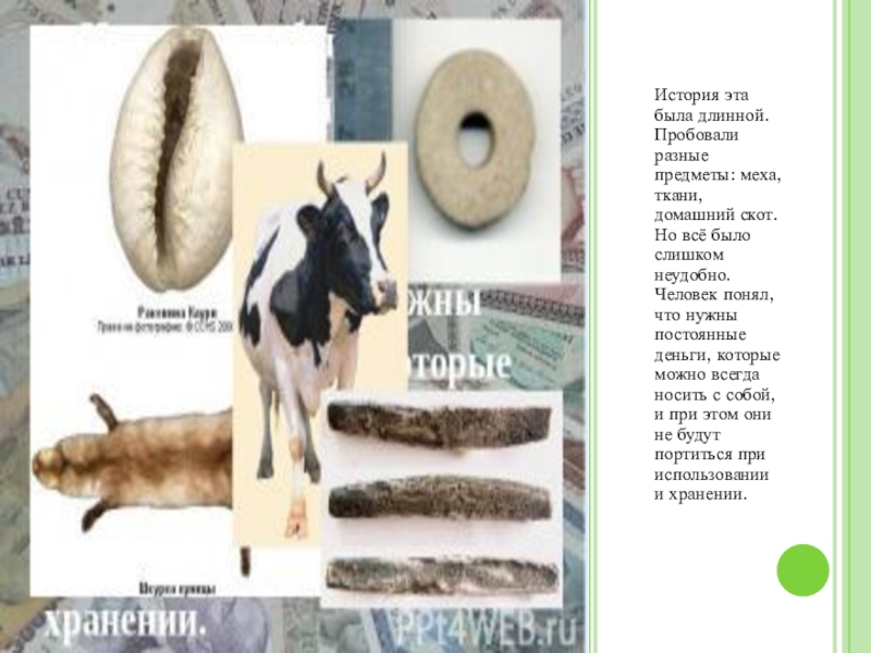 История эта была длинной. Пробовали разные предметы: меха, ткани, домашний скот. Но всё было слишком неудобно. Человек