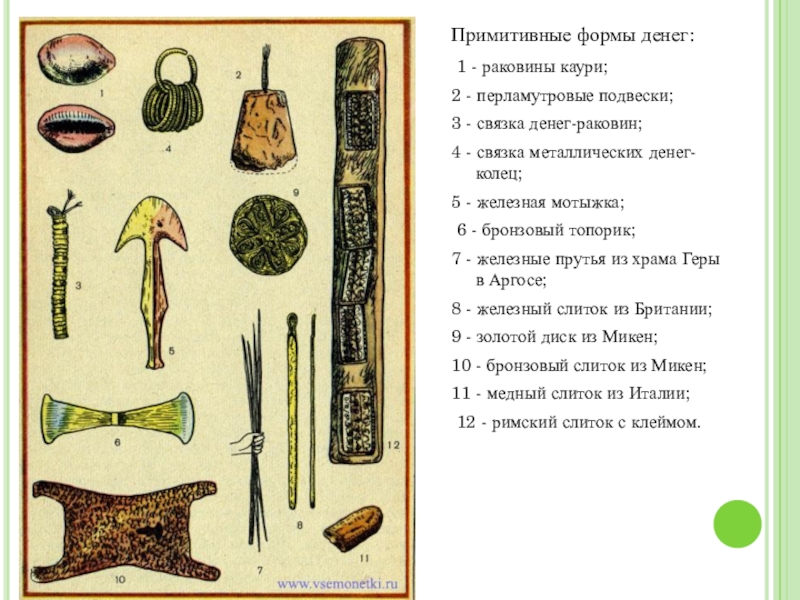 Примитивные формы денег: 1 - раковины каури; 2 - перламутровые подвески; 3 - связка денег-раковин; 4 -