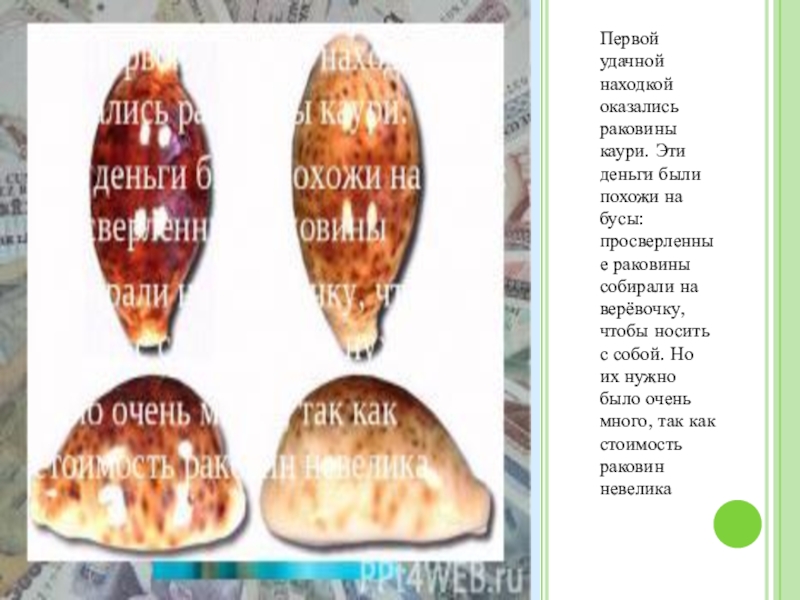 Первой удачной находкой оказались раковины каури. Эти деньги были похожи на