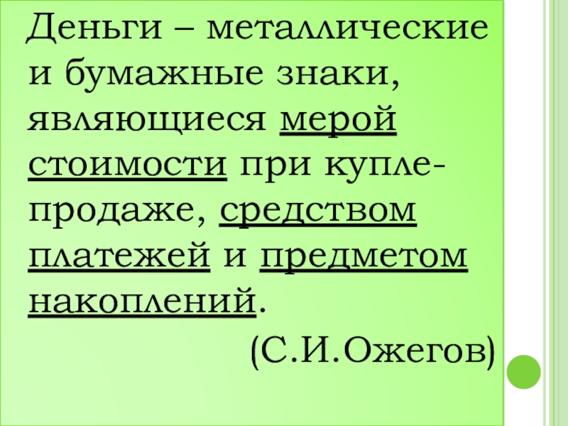 Деньги – металлические и бумажные знаки, являющиеся мерой стоимости при купле-продаже, средством платежей и предметом накоплений. (С.И.Ожегов)
