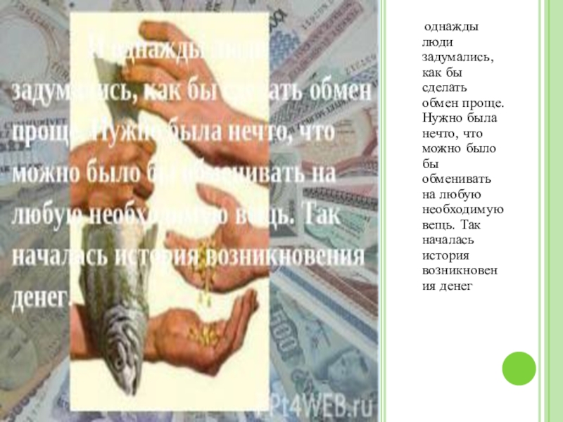В древности, когда деньги ещё не существовали, люди обменивали одни предметы на другие. Но чтобы обмен был