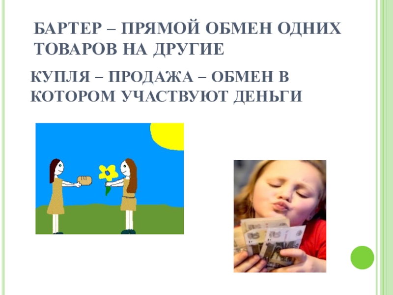 БАРТЕР – ПРЯМОЙ ОБМЕН ОДНИХ ТОВАРОВ НА ДРУГИЕКУПЛЯ – ПРОДАЖА – ОБМЕН В КОТОРОМ УЧАСТВУЮТ ДЕНЬГИ