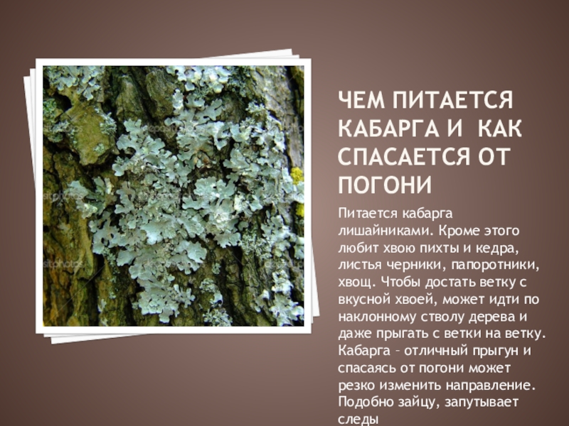 Слайд 4Чем питается кабарга и как спасается от погони