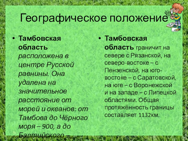 Тамбовская область граничит на севере с Рязанской, на северо-востоке – с Пензенской, на юго-востоке – с Саратовской, на юге – с Воронежской и на западе – с Липецкой областями. Общая протяжённость границы составляет 1132км.
