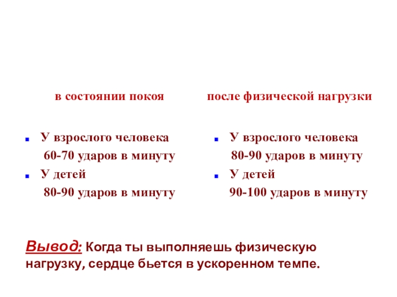 Вывод: Когда ты выполняешь физическую нагрузку, сердце бьется в ускоренном темпе.