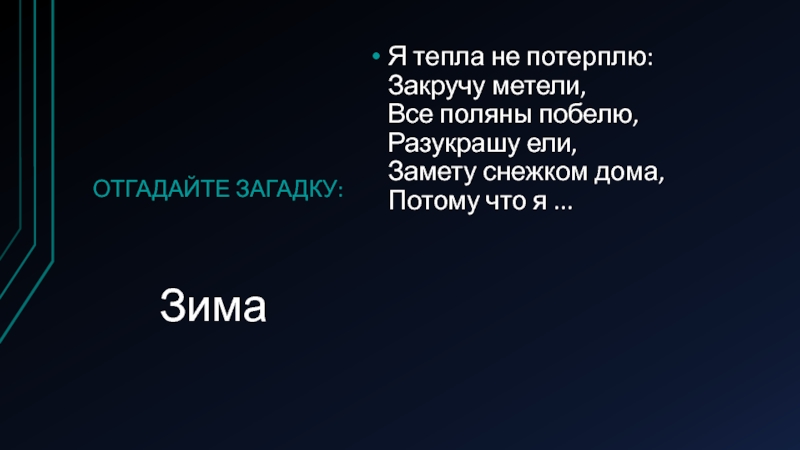 Отгадайте загадку:Я тепла не потерплю: Закручу метели, Все поляны побелю, Разукрашу ели, Замету снежком дома, Потому что