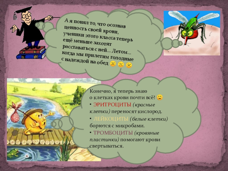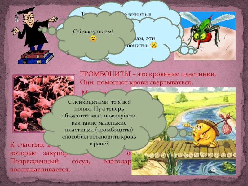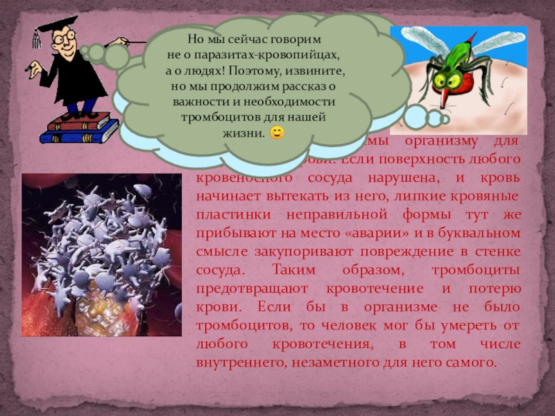 гораздо проще без ваших тромбоцитов! Если бы их не было, то процесс питания был бы для нас более лёгким и приятным!