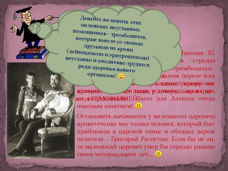 Остановить начавшееся у маленького царевича кровотечение мог только человек, который был приближен к царской семье и обладал даром целителя – Григорий Распутин. Если бы не он, то маленький царевич умер бы гораздо раньше своих четырнадцати лет…