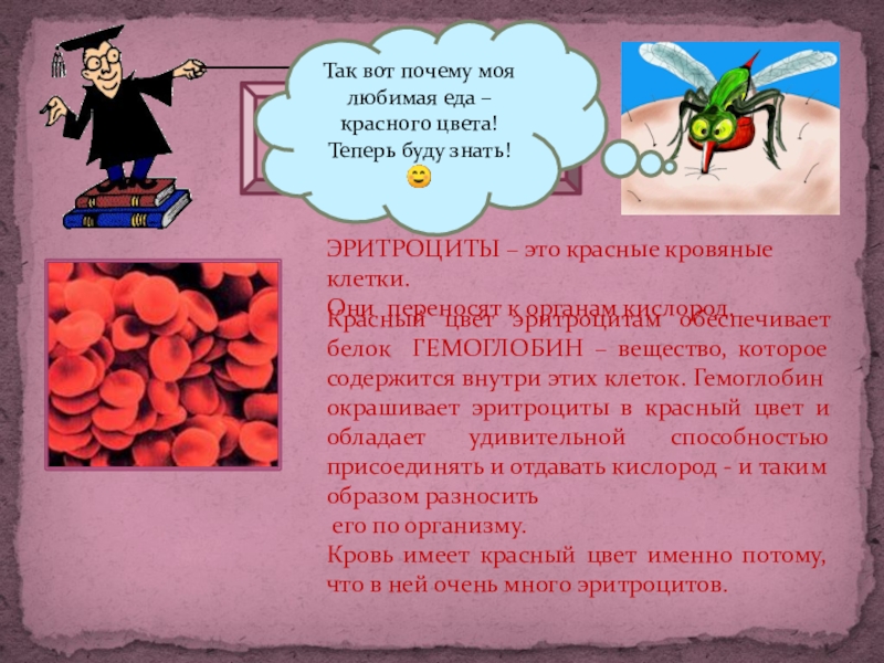 Красный цвет эритроцитам обеспечивает белок ГЕМОГЛОБИН – вещество, которое содержится внутри этих клеток. Гемоглобин окрашивает эритроциты в красный цвет и обладает удивительной способностью присоединять и отдавать кислород - и таким образом разносить