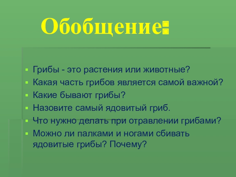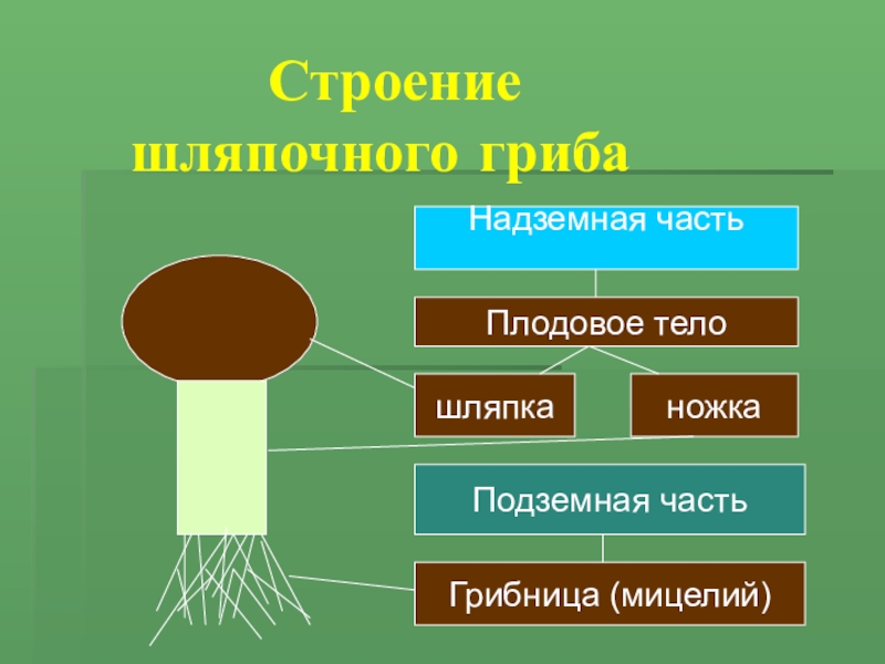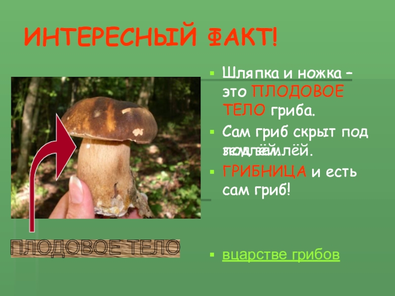 Шляпка и ножка – это ПЛОДОВОЕ ТЕЛО гриба.