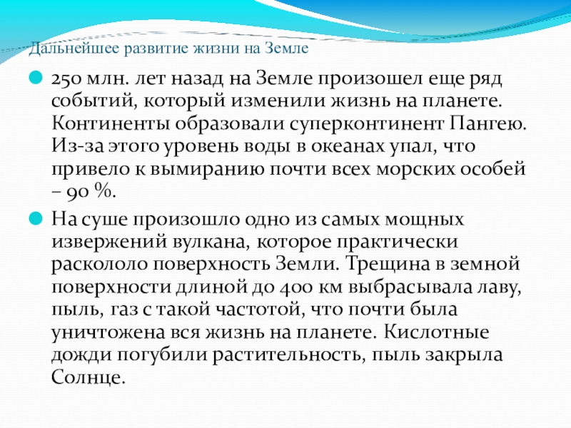 После оледенения появилось множество новых форм жизни, в том числе хищники. Жизнь переместилась на сушу.