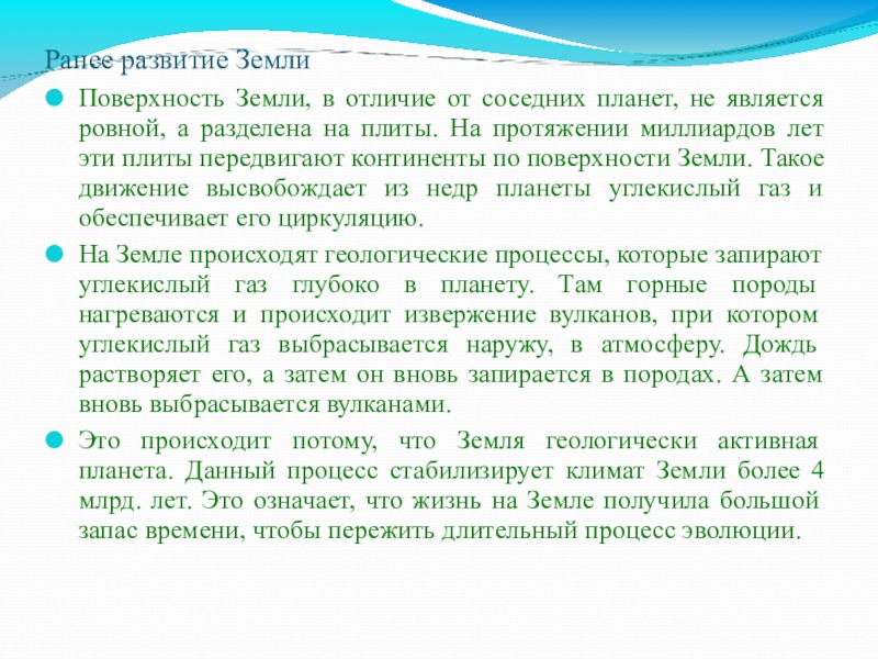 тоже находится ближе к Солнцу, чем Земля. Ее влага испаряется и остается в атмосфере, образуя парниковый эффект. Венера нагрелась до 500 0 С. И планета стала такой горячей, какой мы ее знаем.