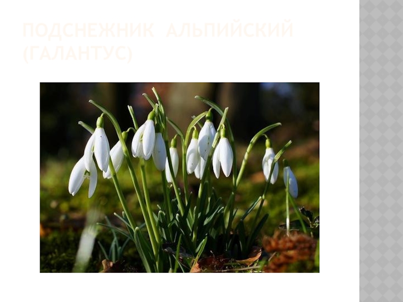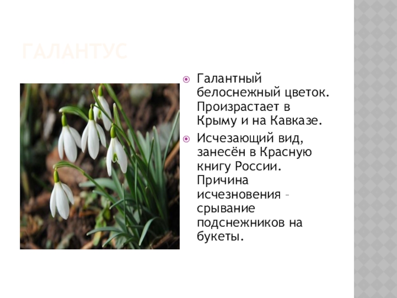 ГалантусГалантный белоснежный цветок. Произрастает в Крыму и на Кавказе.Исчезающий вид, занесён в Красную книгу России. Причина исчезновения