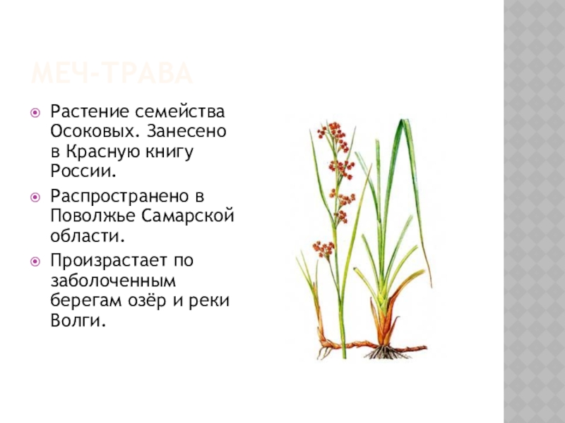 Меч-траваРастение семейства Осоковых. Занесено в Красную книгу России.Распространено в Поволжье Самарской области.Произрастает по заболоченным берегам озёр и
