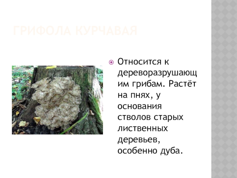 Грифола курчаваяОтносится к дереворазрушающим грибам. Растёт на пнях, у основания стволов старых лиственных деревьев, особенно дуба.