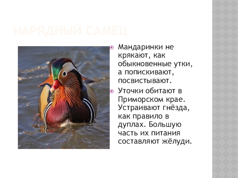 Нарядный самецМандаринки не крякают, как обыкновенные утки, а попискивают, посвистывают.Уточки обитают в Приморском крае. Устраивают гнёзда, как