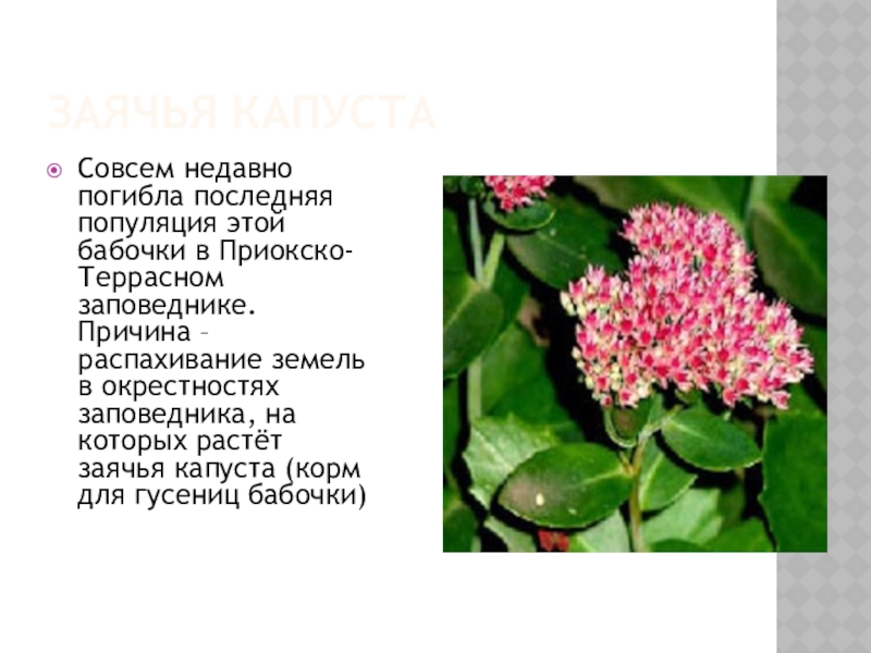 Заячья капустаСовсем недавно погибла последняя популяция этой бабочки в Приокско-Террасном заповеднике. Причина – распахивание земель в окрестностях