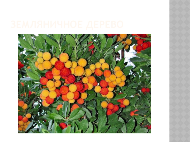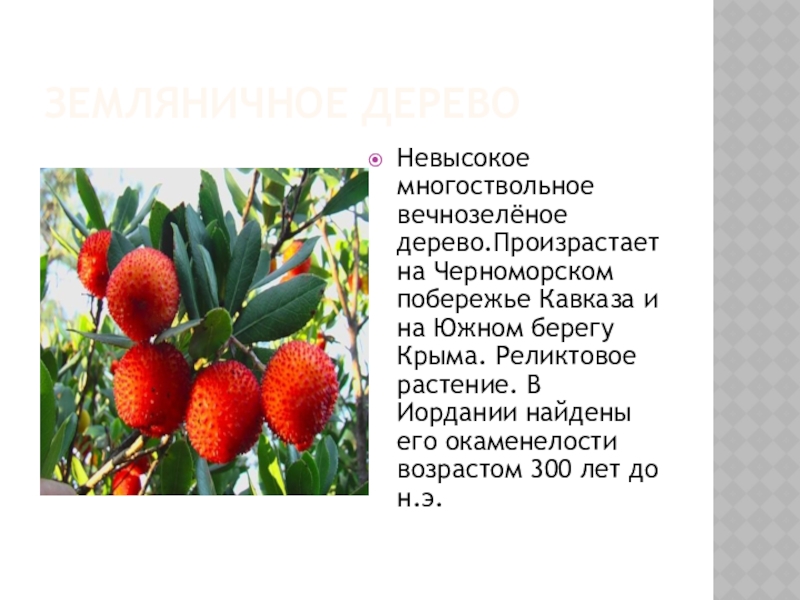Земляничное деревоНевысокое многоствольное вечнозелёное дерево.Произрастает на Черноморском побережье Кавказа и на Южном берегу Крыма. Реликтовое растение. В