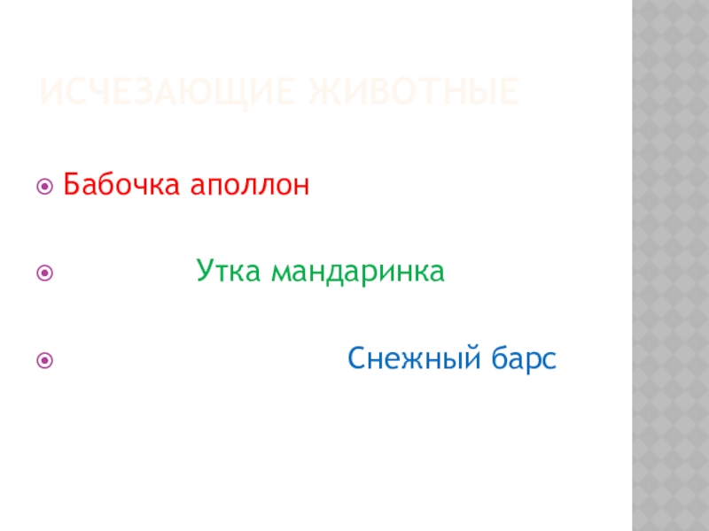 Исчезающие животныеБабочка аполлон Утка мандаринка Снежный барс